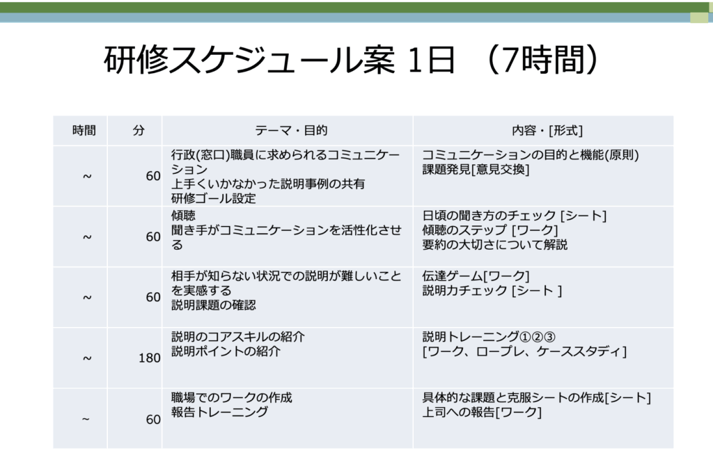 ご機嫌で伝える伝え方(説明力アップ) 説明が苦手な方って意外と多いです。一言で言いますと自信がない。その場合、説明はお互いの理解の仕合っこと捉えます。共通の認識の領域を拡大していくイメージです。特別なスキルを身につけるというよりは、これまでの伝え方をヴァージョンアップしていきましょう。そのためのプログラムです。 *参考:行政職員入社3年目向け研修のカリキュラム 「説明力向上」